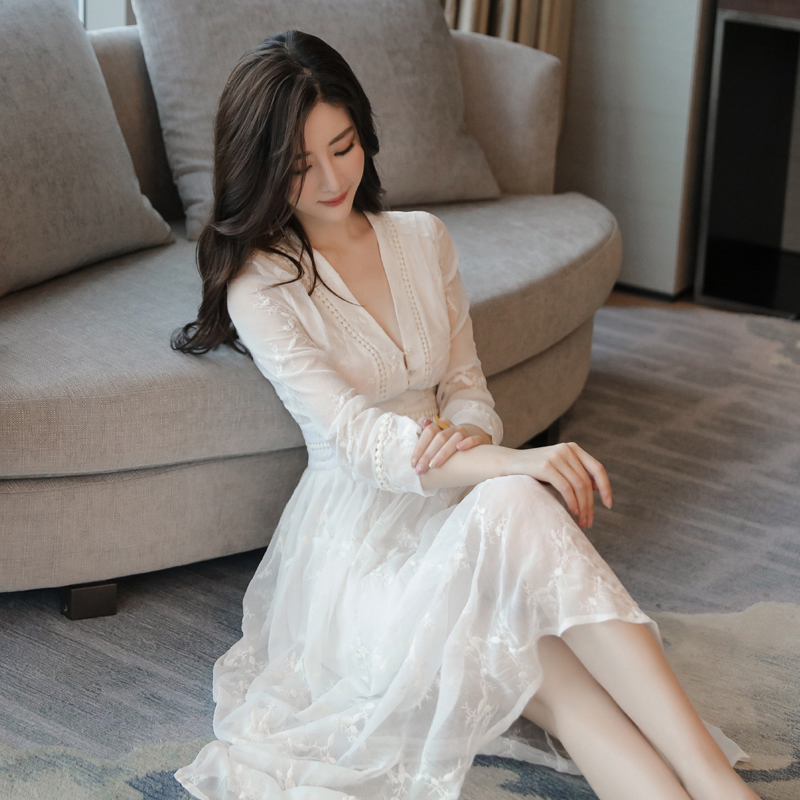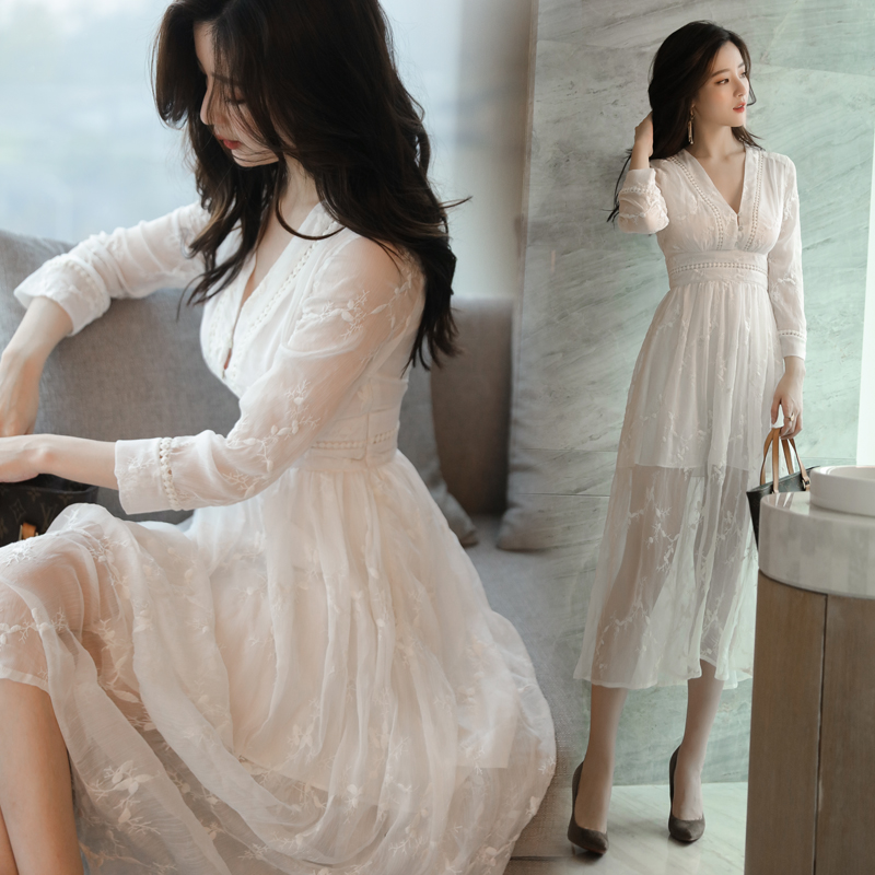 • V领白色蕾丝连衣裙秋冬款新款中长款淑女高腰长袖打底公主裙