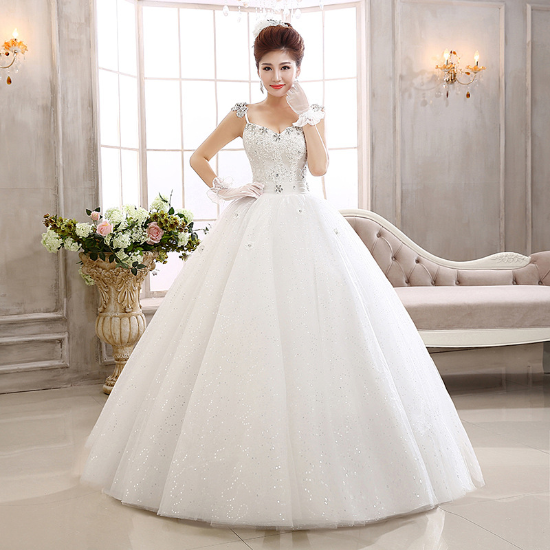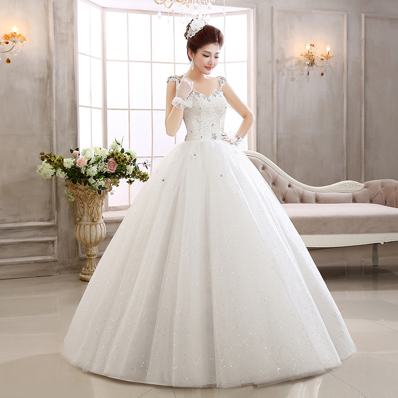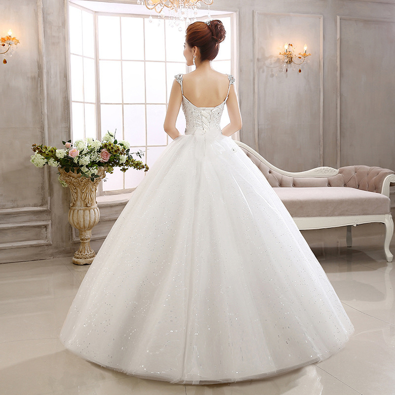 蕾丝闪钻肩带齐地蓬裙 新娘结婚婚纱礼服