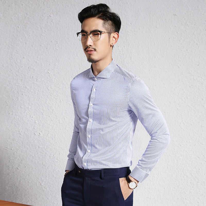 新品男士休闲衬衣修身长袖条纹衬衫欧美简约温莎领寸衬