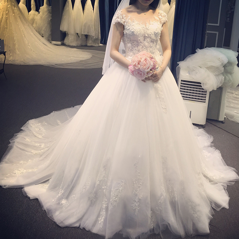 一字肩婚纱拖尾婚纱2017新款简约夏季齐地婚纱简约甜美公主婚