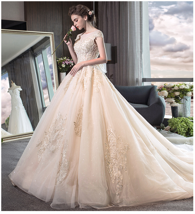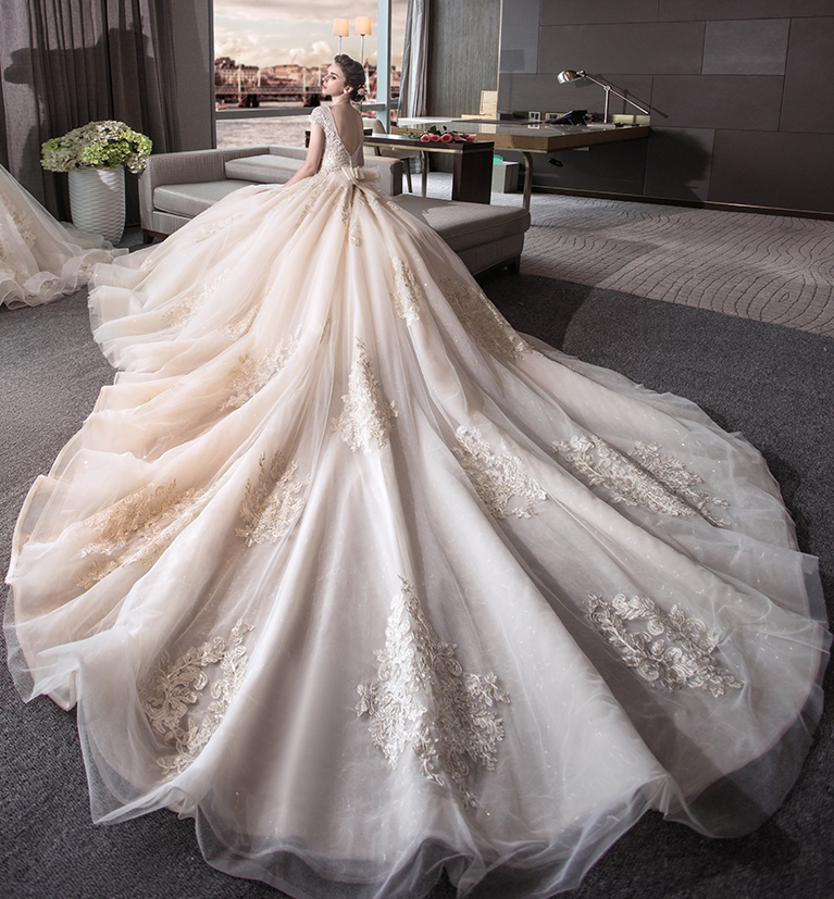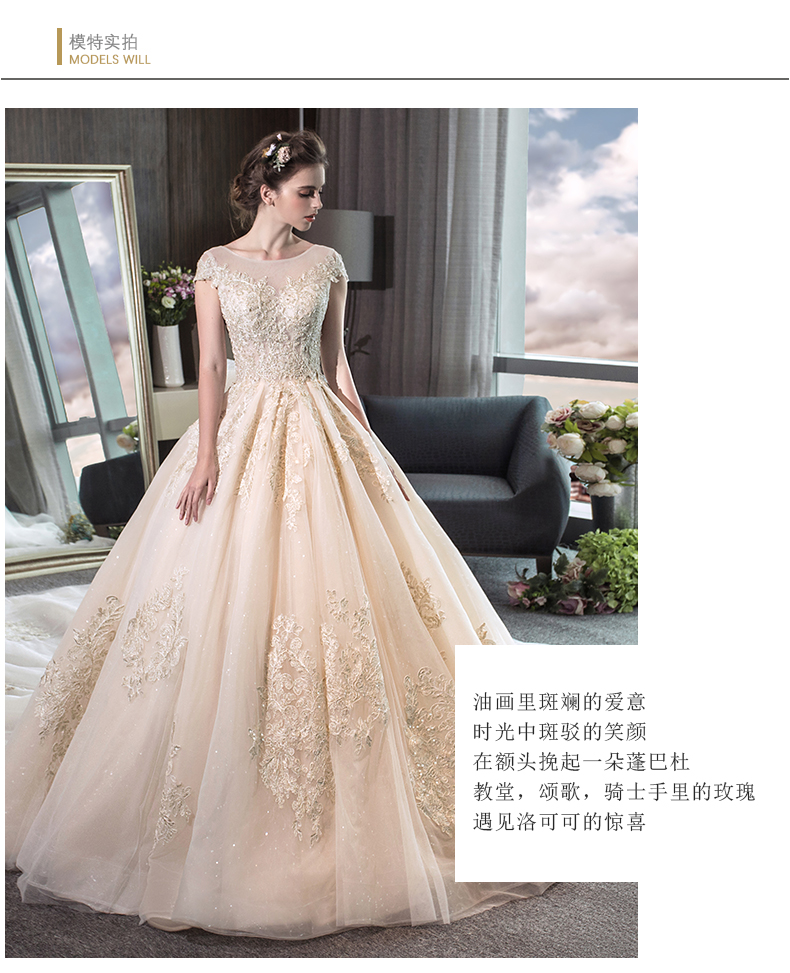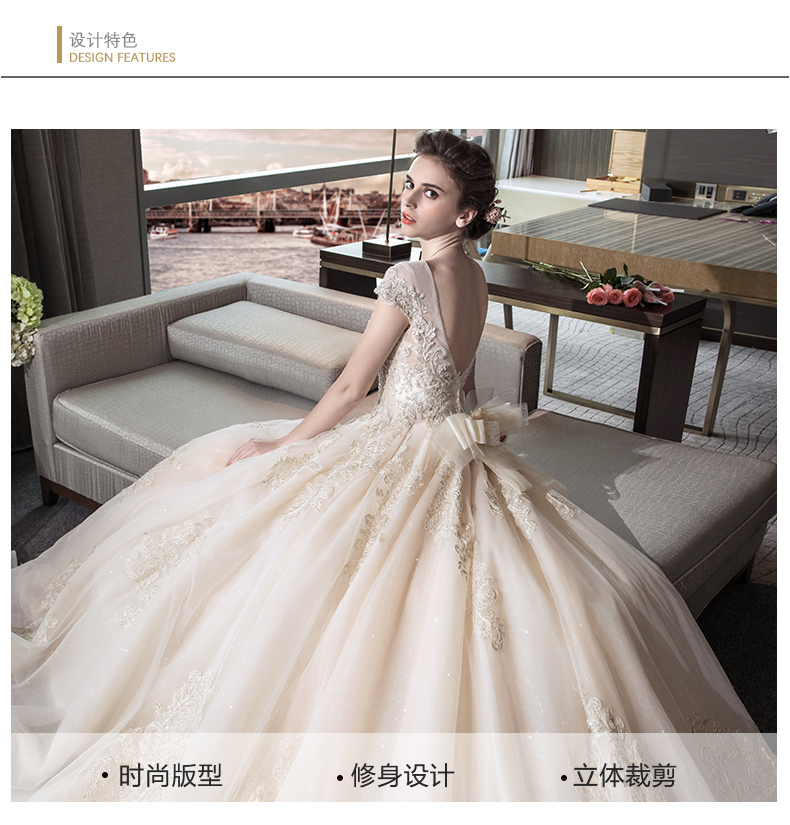 • 新款长拖尾奢华宫廷结婚齐地显瘦一字肩孕妇婚纱礼服新娘65Q