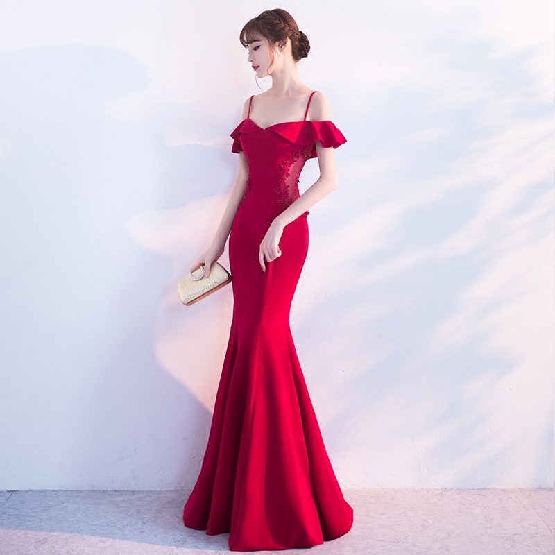 • 红色新娘敬酒服2017结婚新款一字肩鱼尾晚礼服女性感修身显瘦
