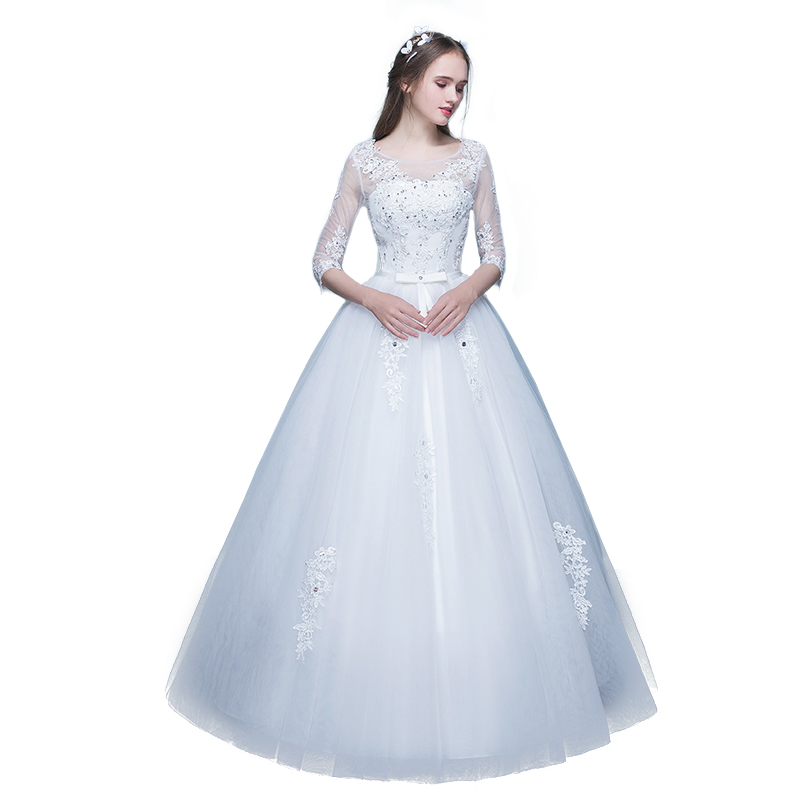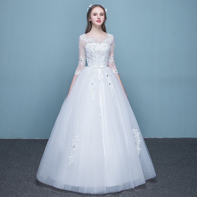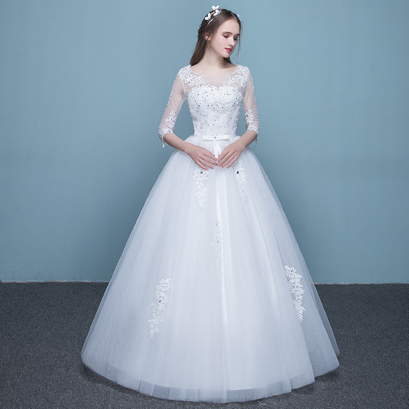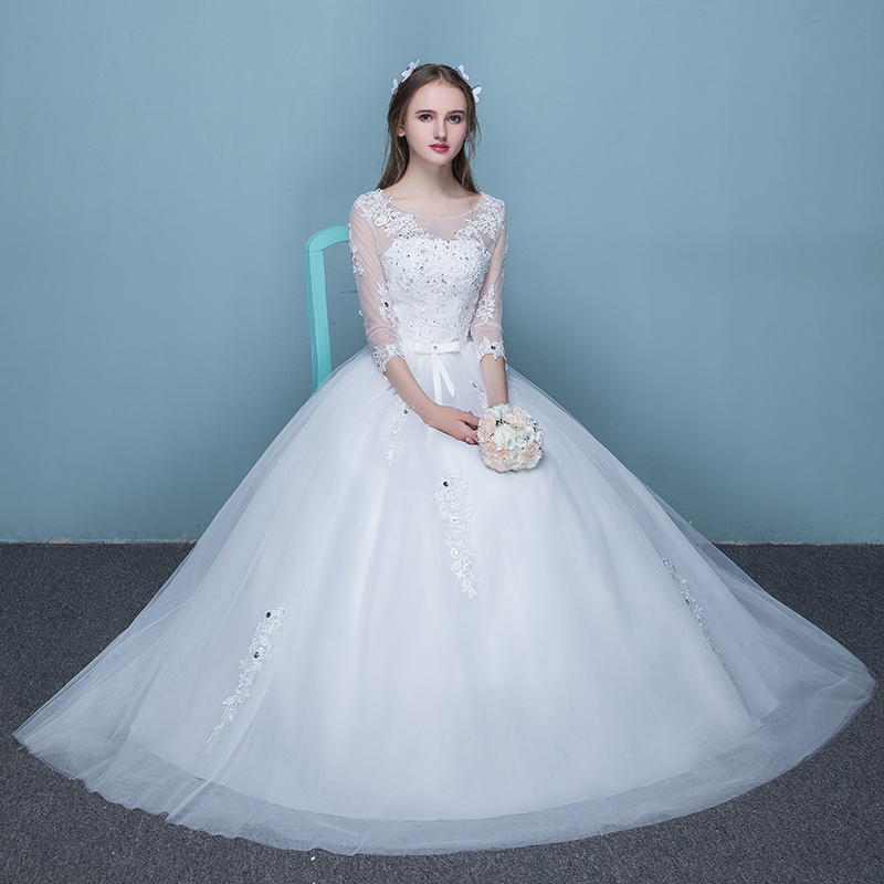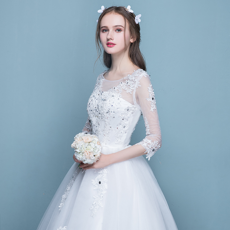 • 新款新娘一字肩齐地婚纱蕾丝亮钻婚纱新娘礼服(买就送三件套)