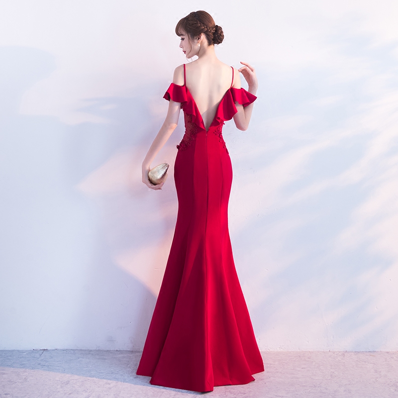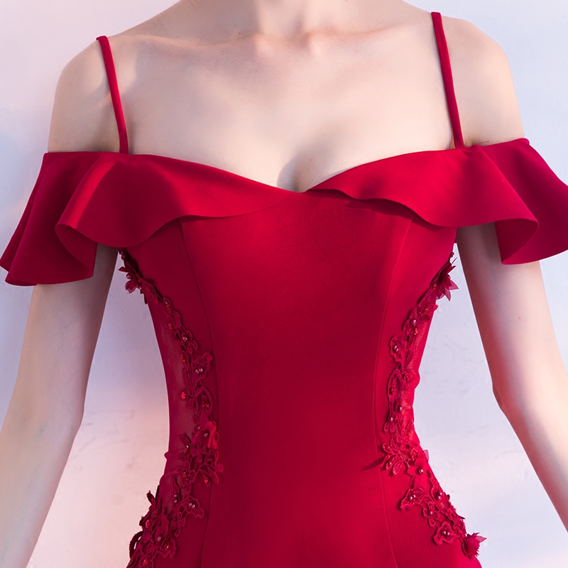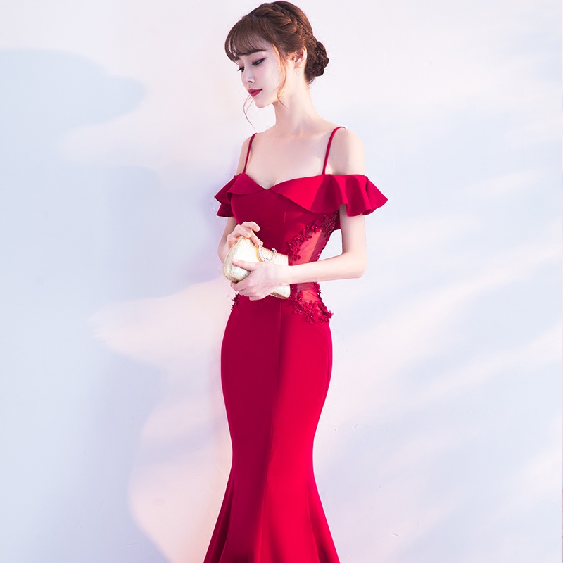 • 红色新娘敬酒服2017结婚新款一字肩鱼尾晚礼服女性感修身显瘦