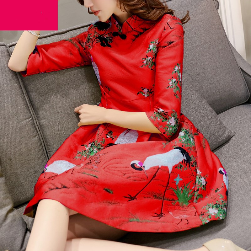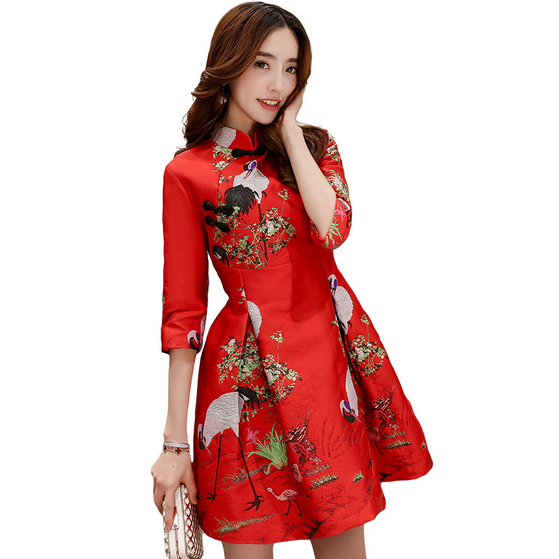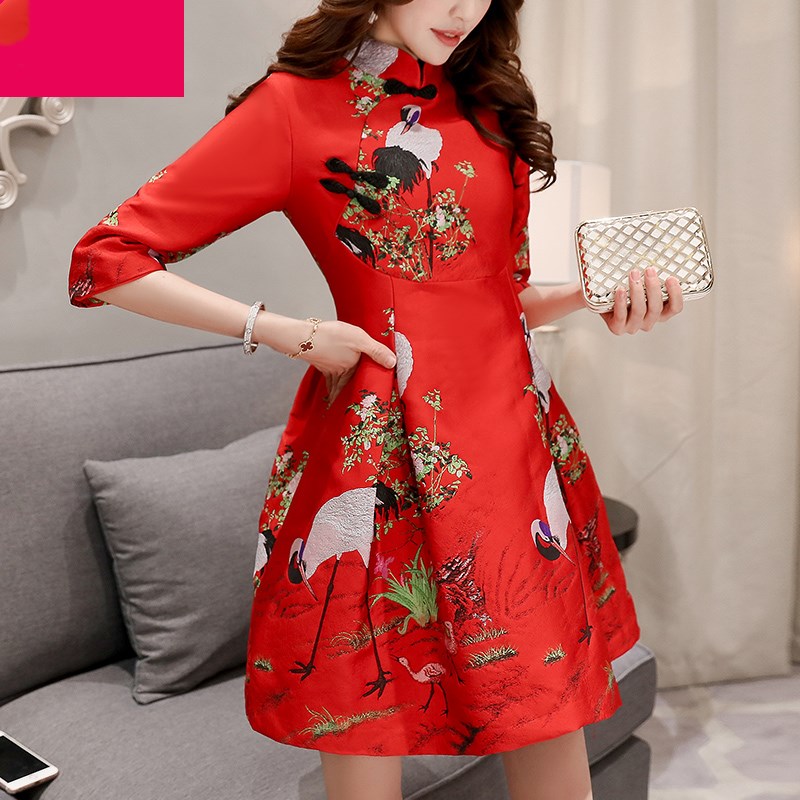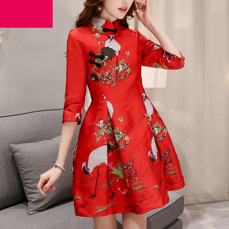 • 改良旗袍裙仙鹤刺绣红色连衣裙中裙秋季新款气质新娘礼服回门