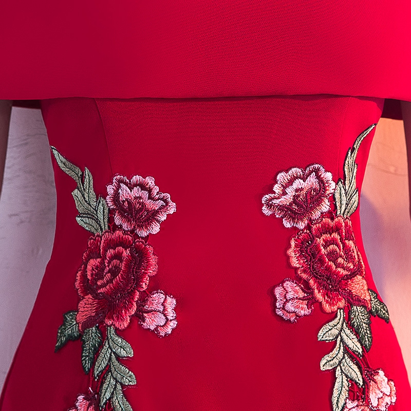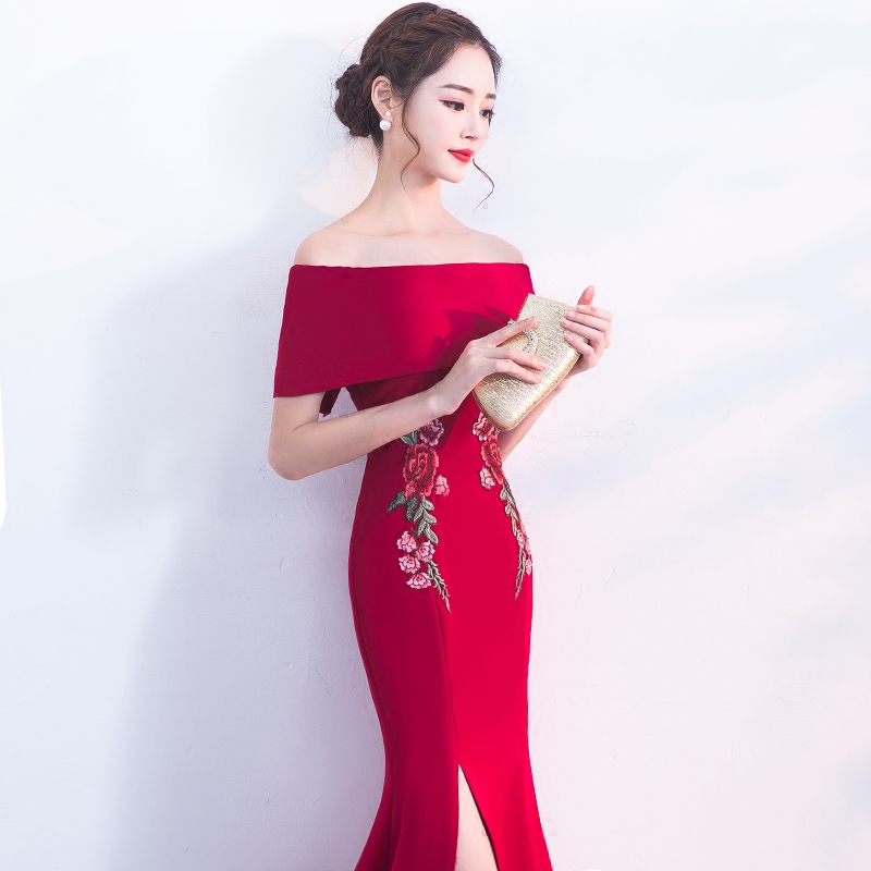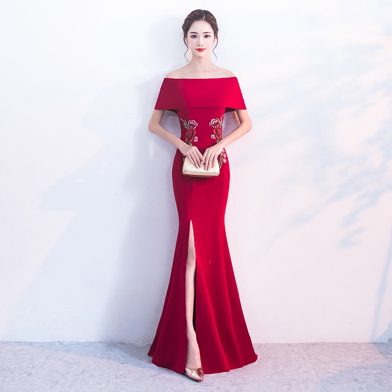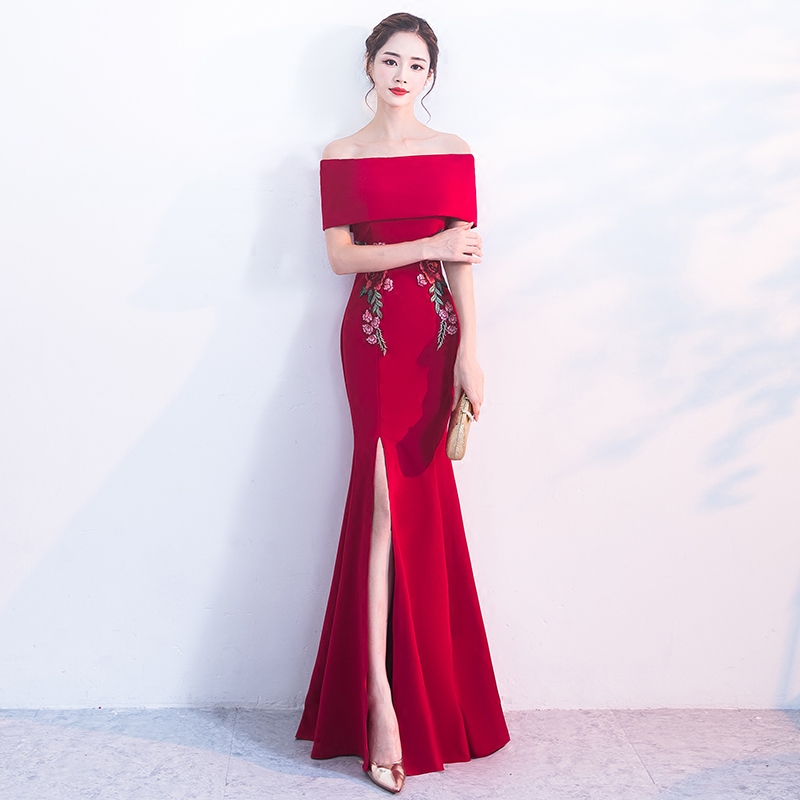 • 一字肩敬酒服新娘红色2017结婚新款秋冬宴会性感鱼尾晚礼服女