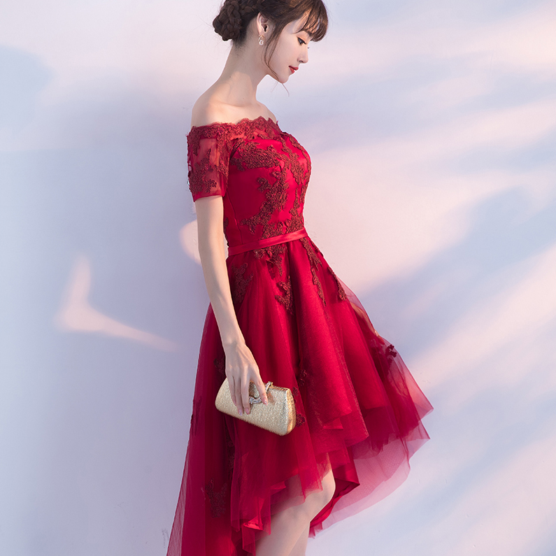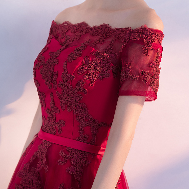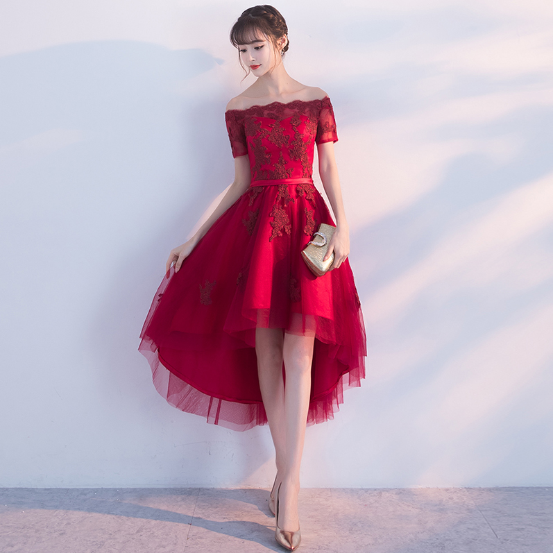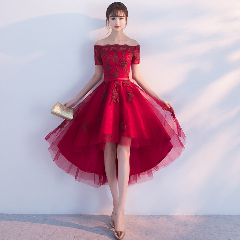 修身显瘦!2017新款夏季一字肩修身结婚礼服连衣裙前短后长
