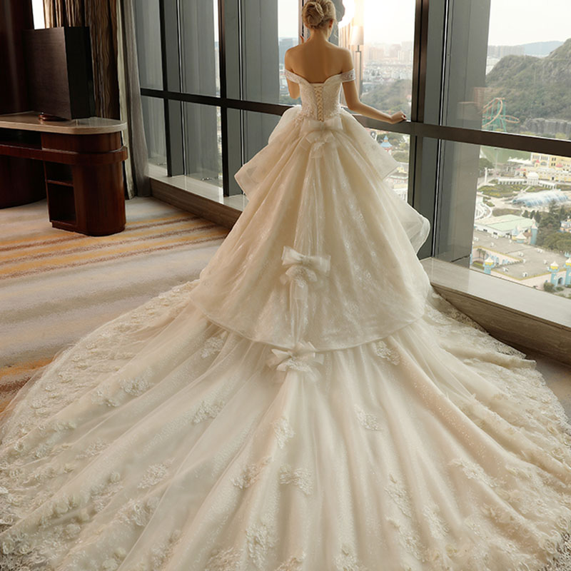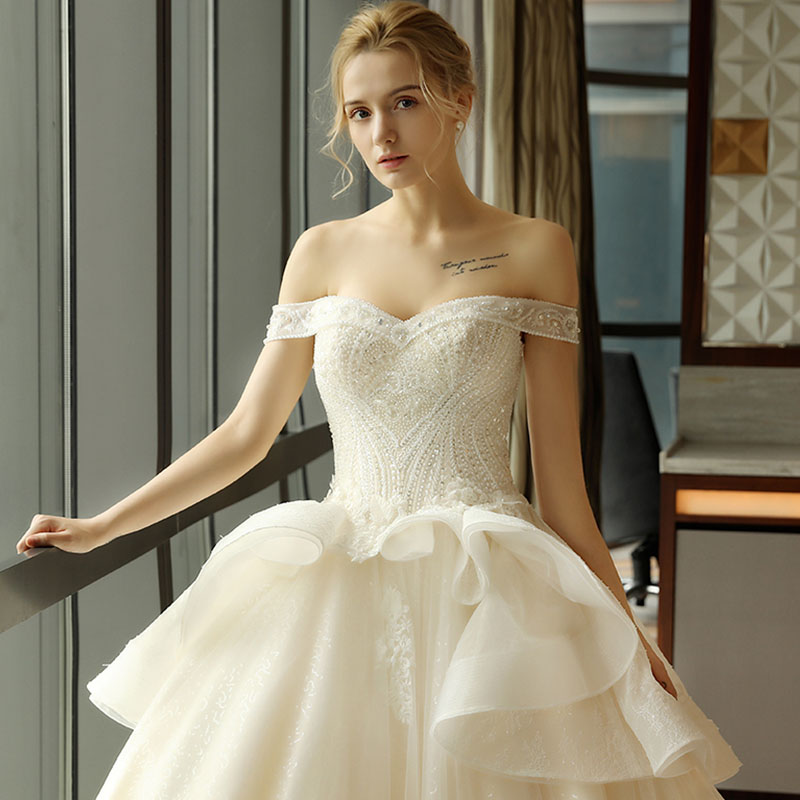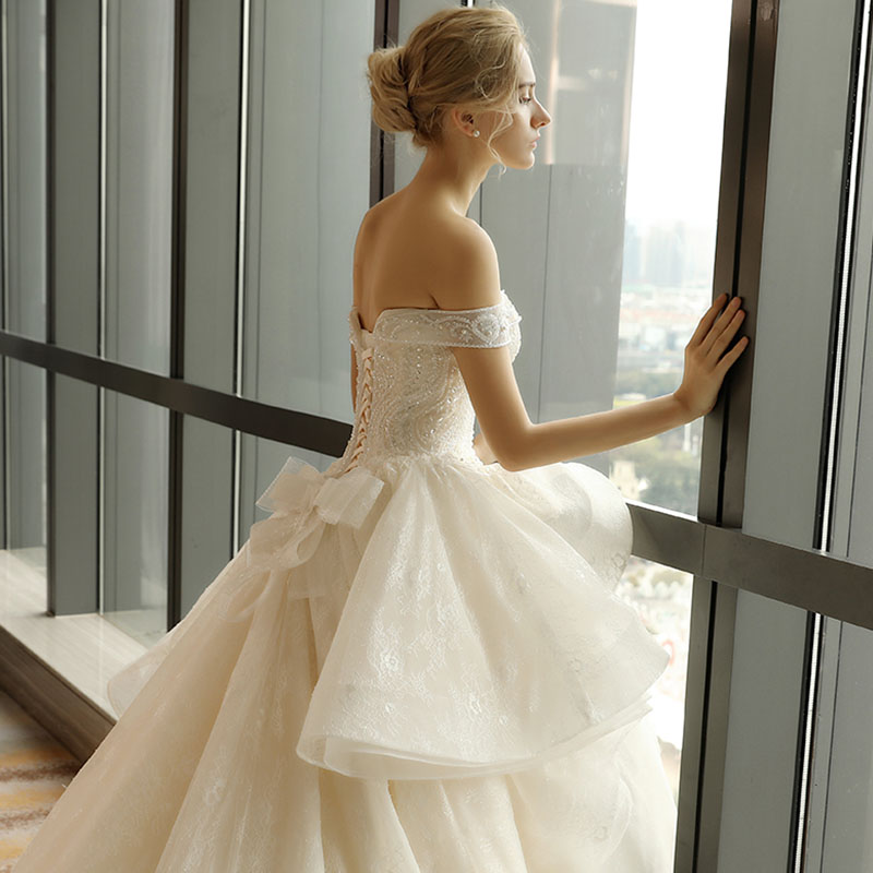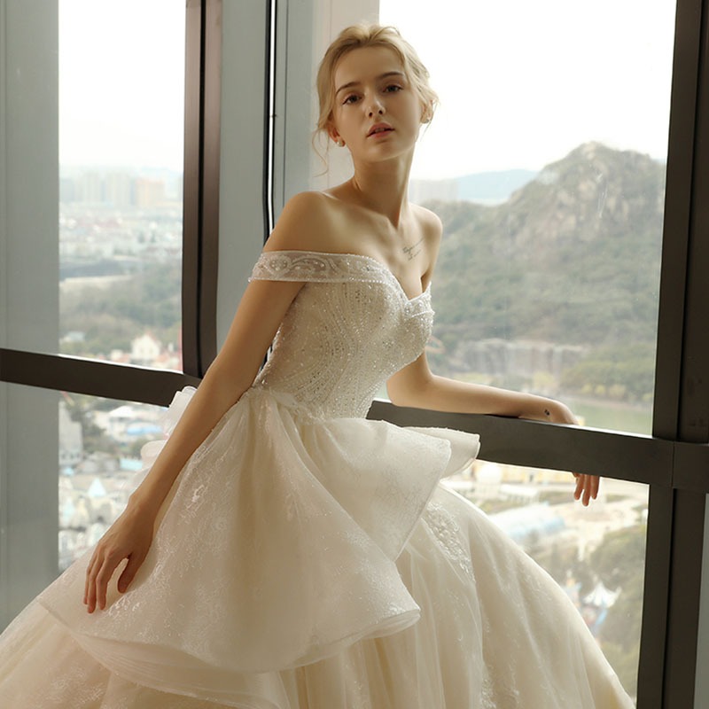 • 735一字肩显瘦新娘结婚奢华长拖尾宫廷公主钻饰婚纱礼服