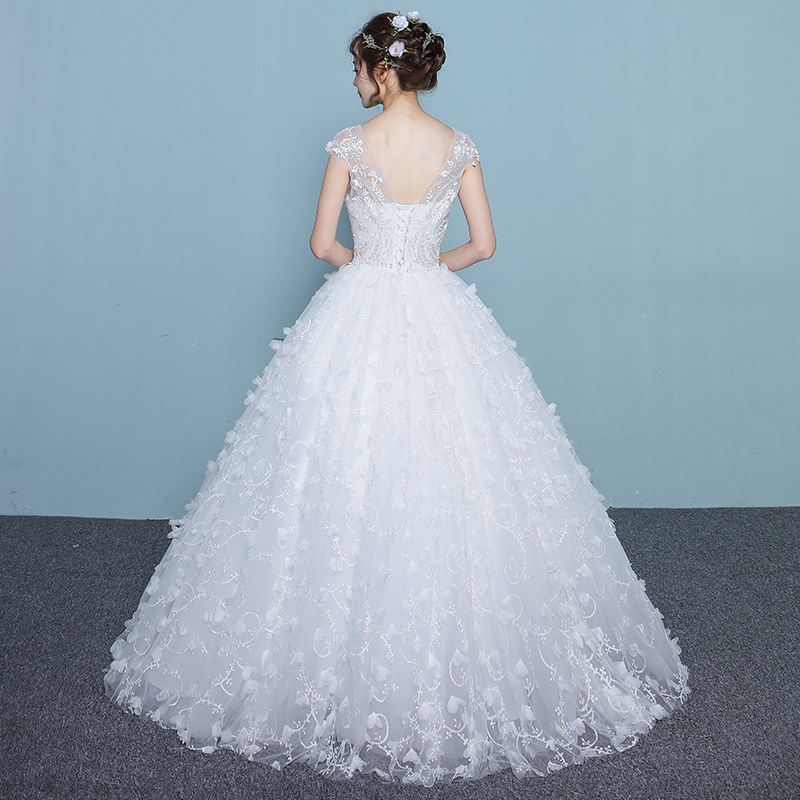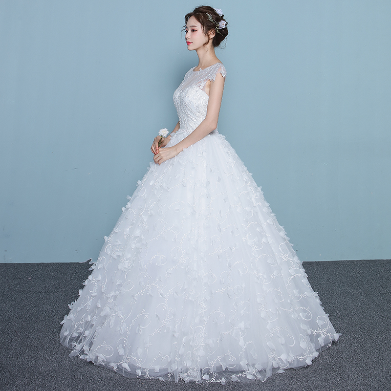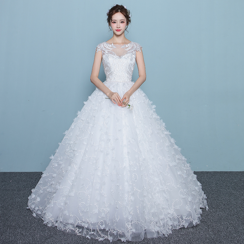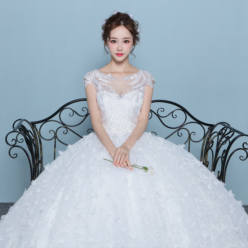 • 婚纱礼服新娘2017新款韩式一字肩齐地婚纱长拖尾花朵大码显瘦