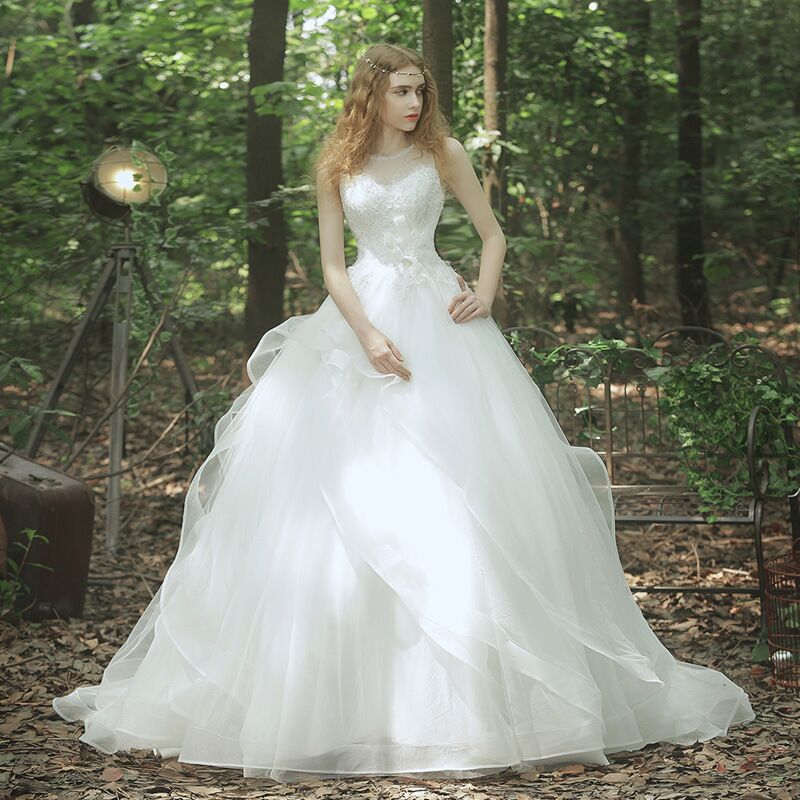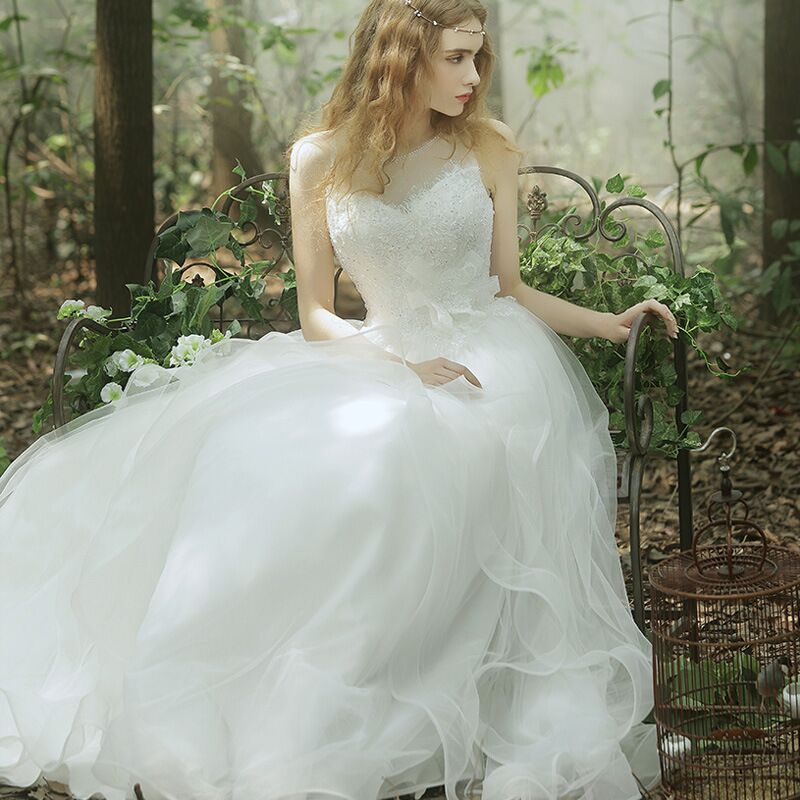 新娘双肩蕾丝花朵婚纱大码小拖尾森系60厘米拖婚纱