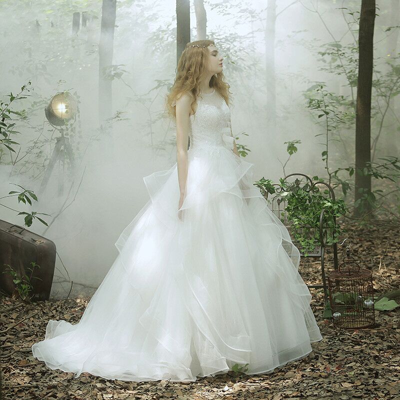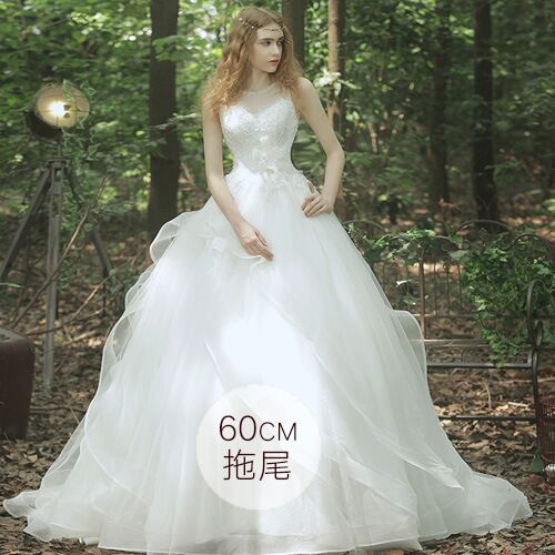 • 新娘双肩蕾丝花朵婚纱大码小拖尾森系60厘米拖婚纱