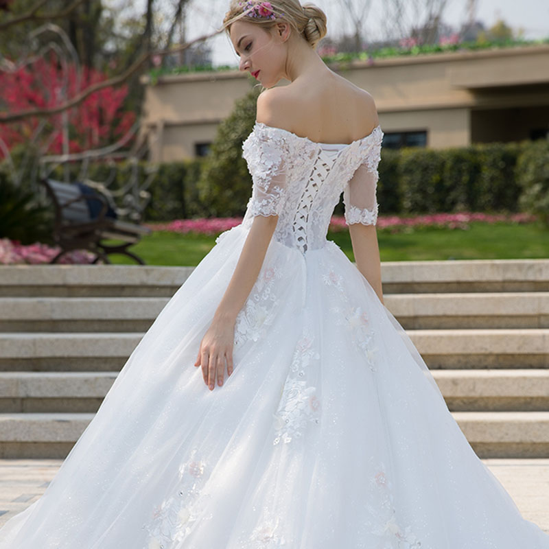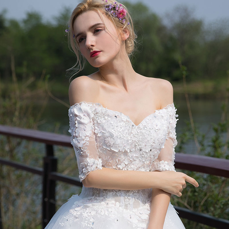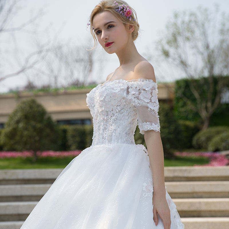 • 新款冬季韩式显瘦大码新娘结婚花朵一字肩婚纱礼服796