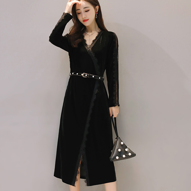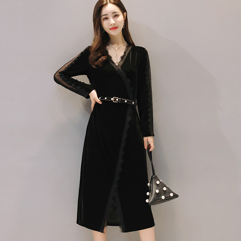 • 2017秋装新款长袖金丝绒连衣裙女韩版中长款秋冬气质302