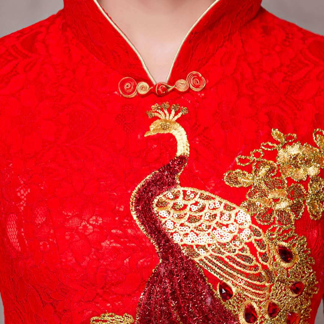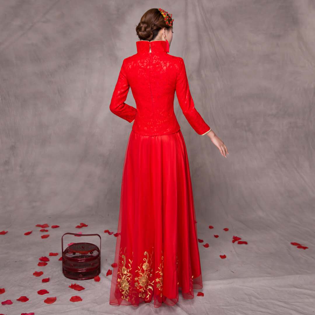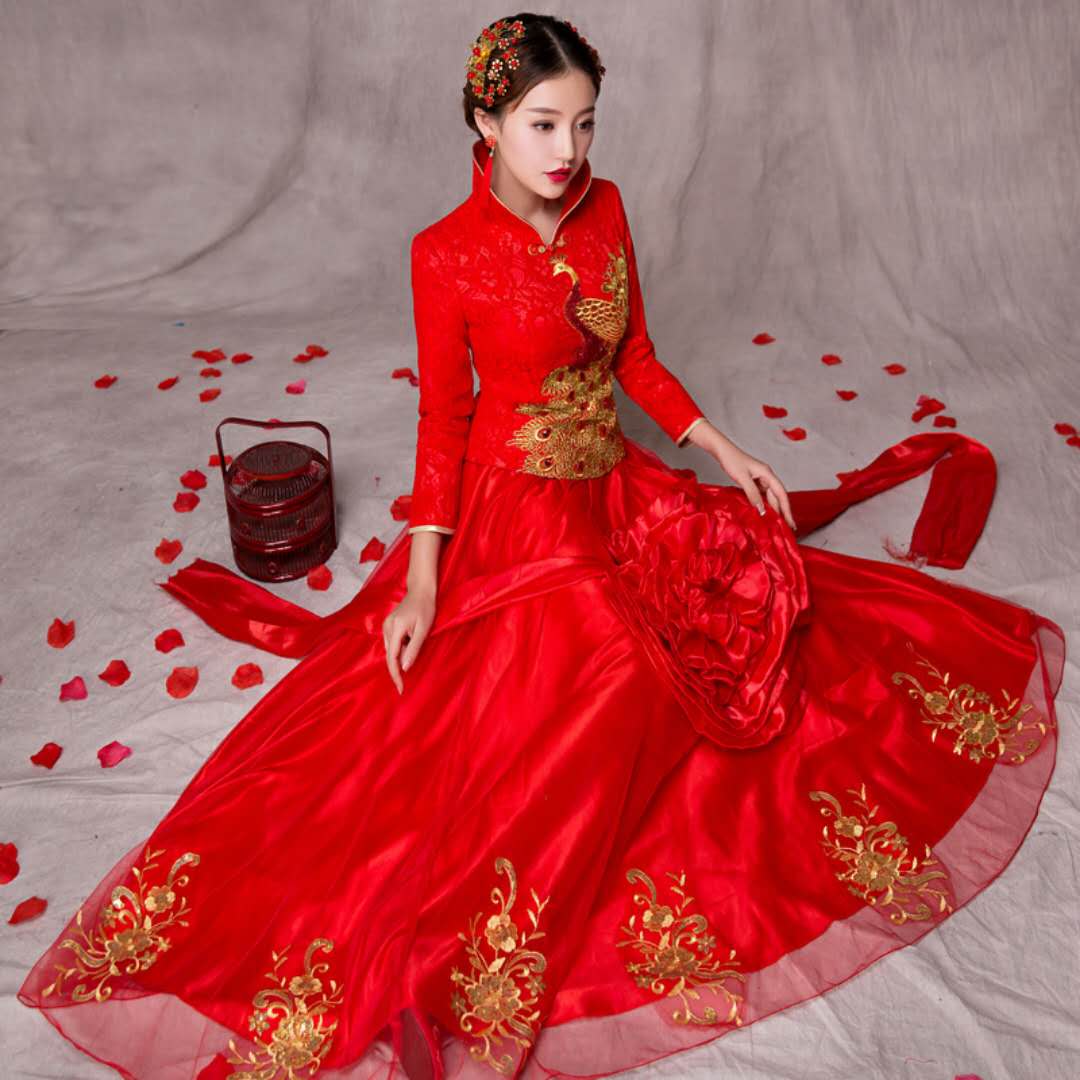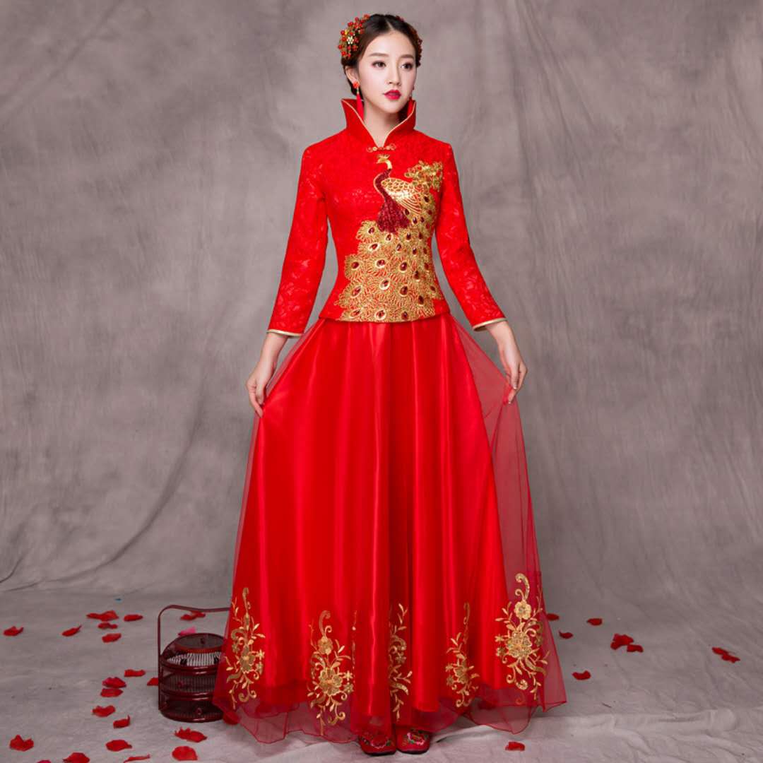 • 2017真丝长款改良旗袍婚纱秀禾服新娘唐装伴娘服结婚礼服