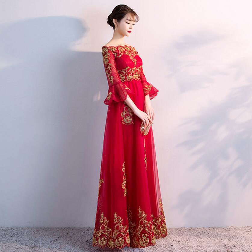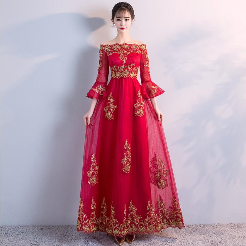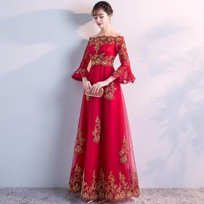 • 高腰大码设计!敬酒服新娘孕妇长款长袖一字肩结婚礼服