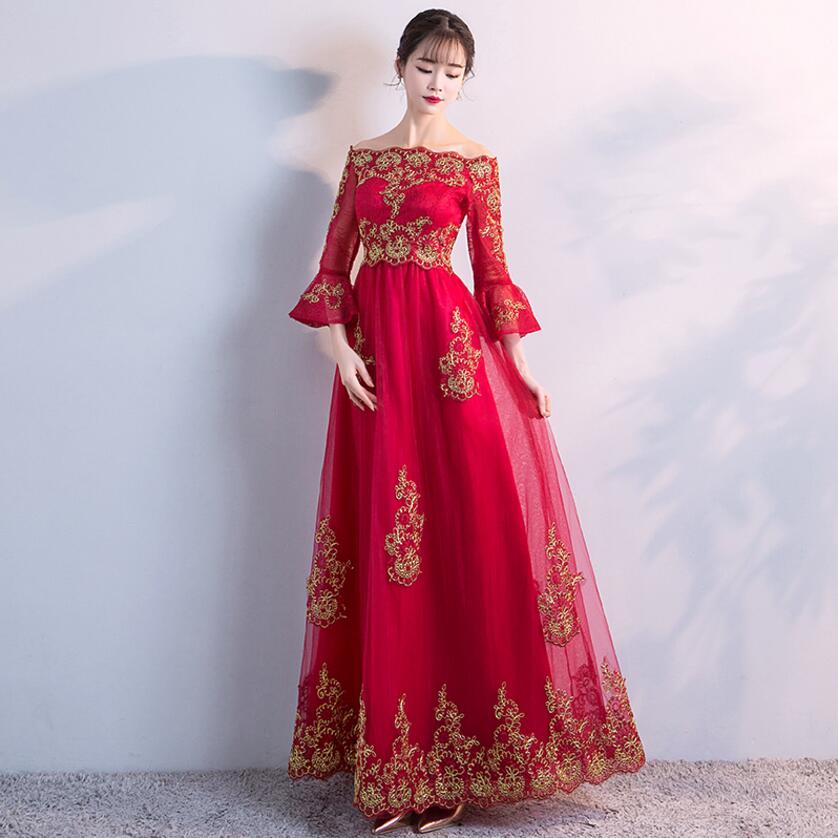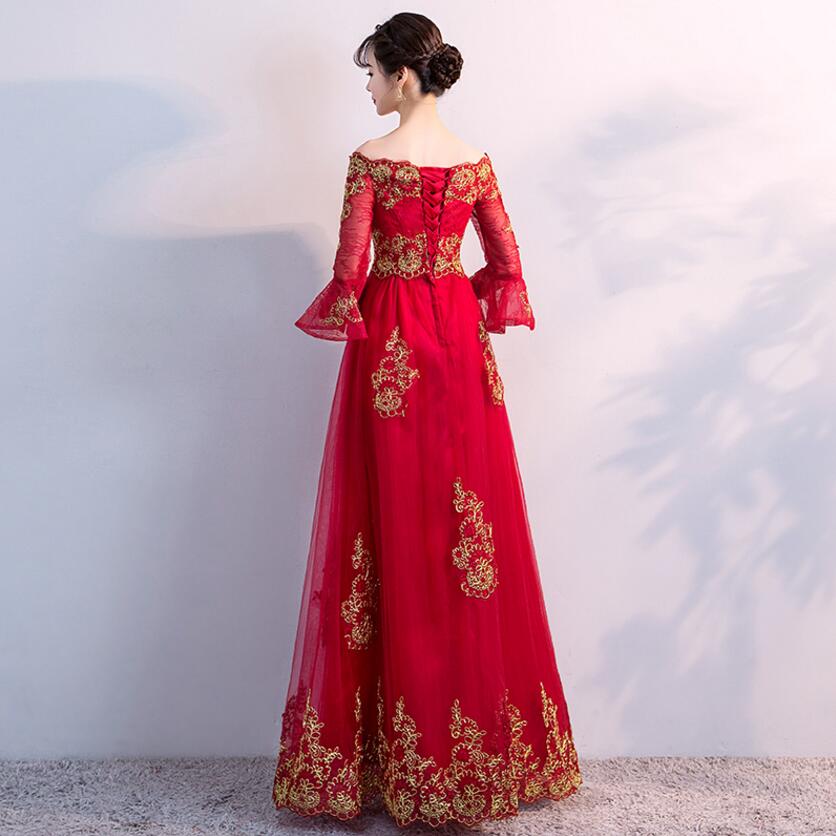 高腰大码设计!敬酒服新娘孕妇长款长袖一字肩结婚礼服
