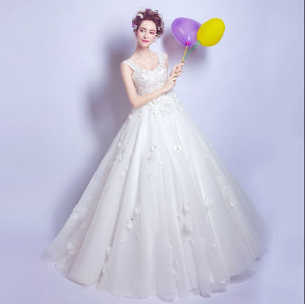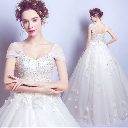 修身显瘦遮手臂一字肩花朵蕾丝公主新娘修身齐地婚纱礼服