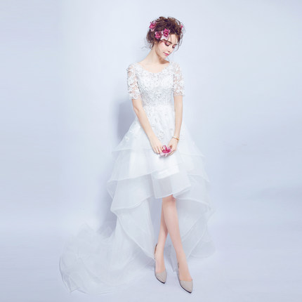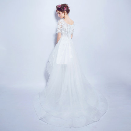 甜美蕾丝花朵透视前短后长款拖尾新娘婚纱礼服2016夏季新款