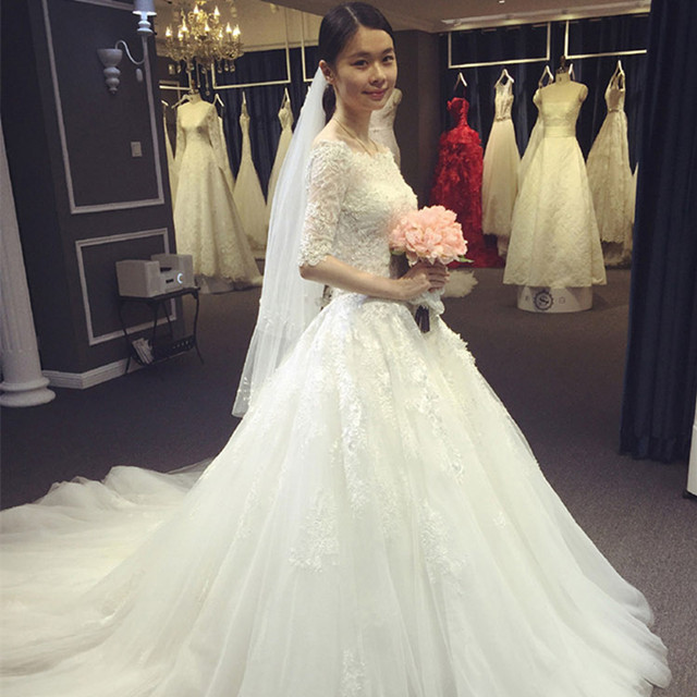• 韩式新款长拖尾蕾丝花朵简约婚纱礼服新娘结婚一字肩长袖齐地