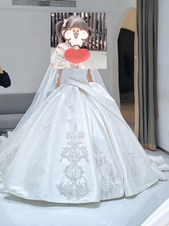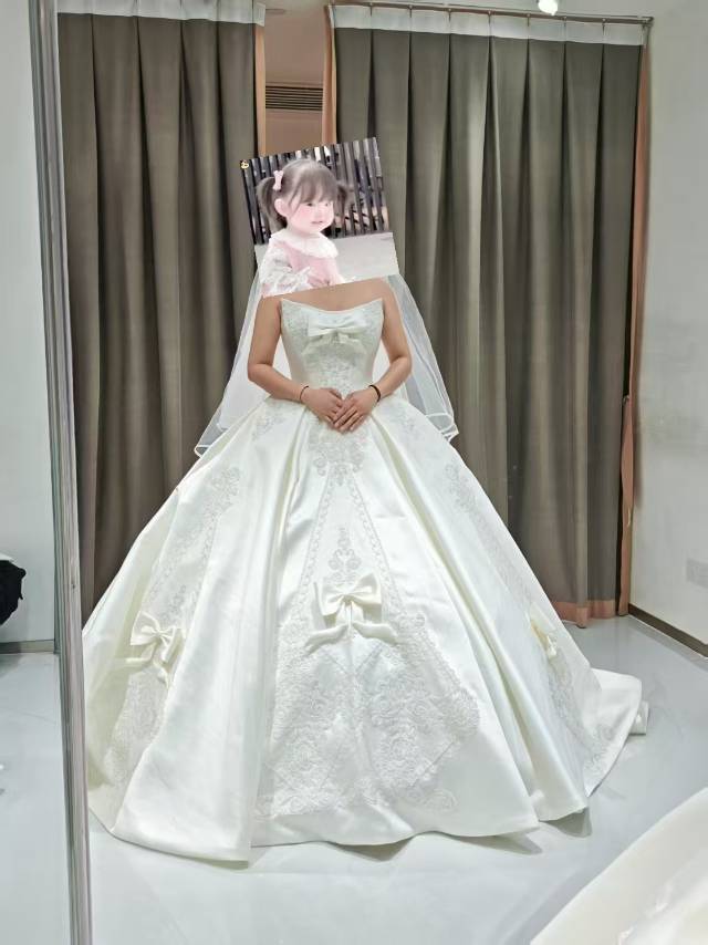 这款爆闪主纱简直是“行走的银河”!全身满镶的高亮度碎钻[哇] 灯光下折射出密集璀璨的光芒,每走一步都自带高光特效。[色]修身剪裁衬出好身材,大拖尾铺开瞬间闪度翻倍,精致钉珠细节质感拉满。穿上就是全场焦点,完全满足对闪耀婚礼的所有期待,体验感超赞!店员贴心搭配了头纱,备婚姐妹可冲[勾引]