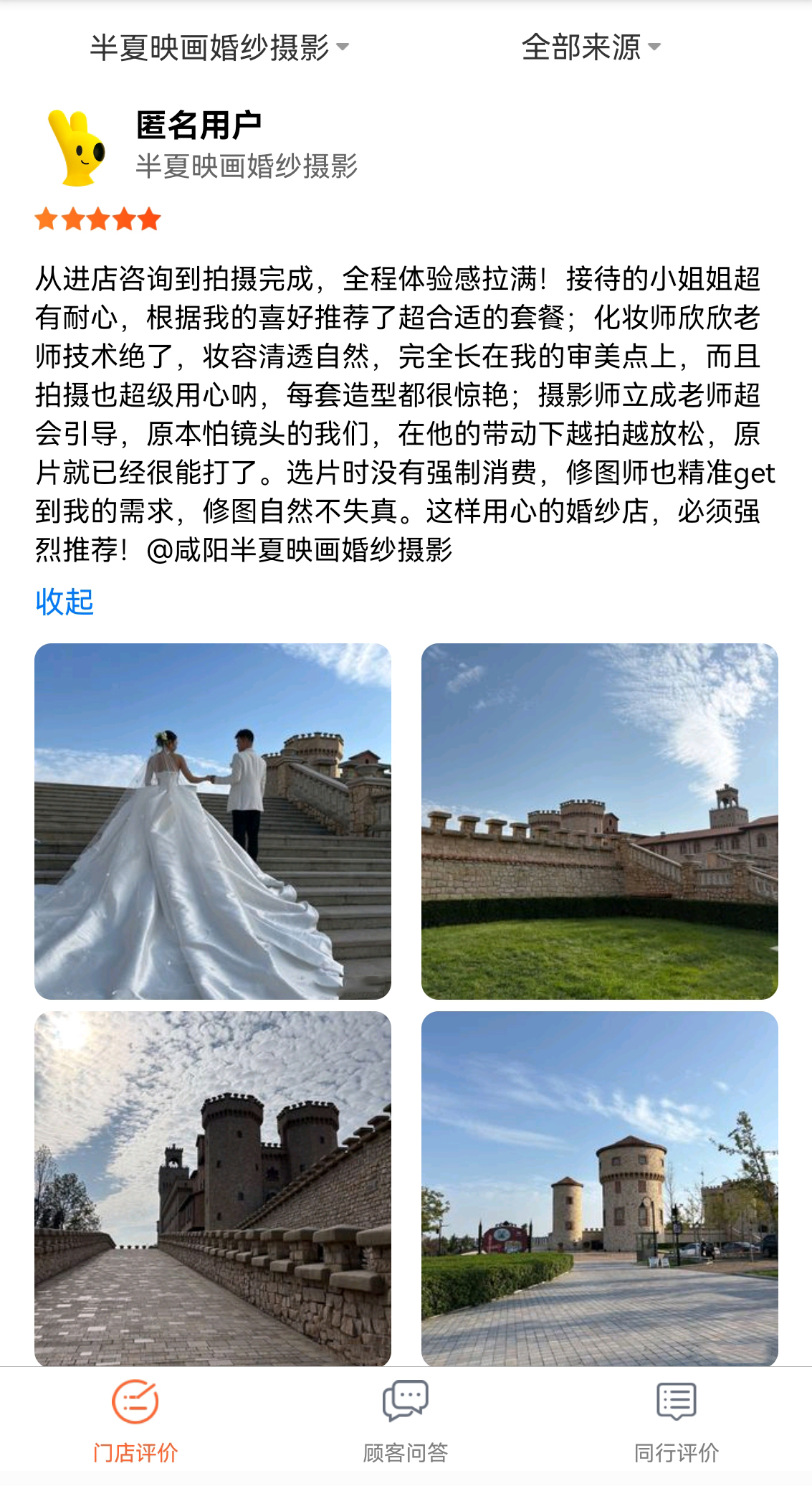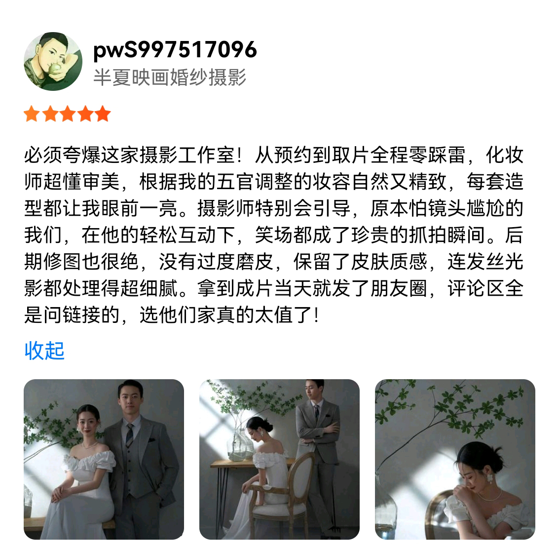 从进店咨询到拍摄完成,全程体验感拉满!接待的小姐姐超有耐心,根据我的喜好推荐了超合适的套餐;化妆师欣欣老师技术绝了,妆容清透自然,完全长在我的审美点上,而且拍摄也超级用心呐,每套造型都很惊艳:摄影师立成老师超会引导,原本怕镜头的我们,在他的带动下越拍越放松,原片就已经很能打了。选片时没有强制消费,修图师也精准get到我的需求,修图自然不失真。这样用心的婚纱店,必须强烈推荐!